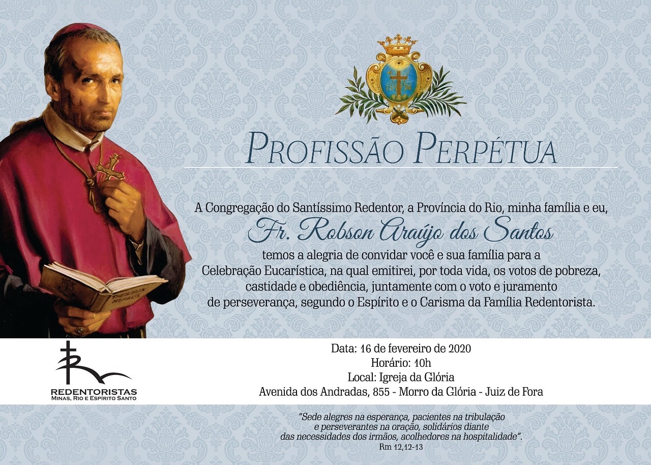 Às vésperas de emitir os votos perpétuos, consagrando-se a Deus definitivamente, o Fr. Robson Araújo dos Santos, C.Ss.R. afirma estar consciente desta escolha e não tem dúvidas: “Sinto-me realizado em saber que é Ele, o criador da vida, a quem estou consagrando toda minha existência”.